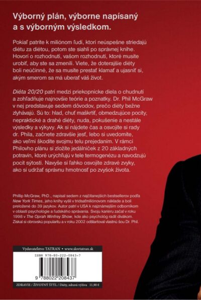 Diéta 20/20 patrí medzi priekopnícke diela o chudnutí a zohľadňuje najnovšie teórie a poznatky. Dr. Phil McGraw v nej predstavuje sedem dôvodov, prečo diéty bežne zlyhávajú. Sú to: hlad, chuť maškrtiť, obmedzujúce pocity, nepraktické a drahé diéty, nuda, pokušenie a nestále výsledky a výkyvy. Ak si nájdete čas a osvojíte si rady Dr. Phila, začnete zdravšie jesť, lebo si uvedomíte, ako veľmi škodíte svojmu telu prejedaním. V rámci Philovho plánu si zložíte jedálniček z 20 základných potravín, ktoré urýchľujú v tele termogenézu a navodzujú pocit sýtosti. Navyše si ľahko osvojíte zdravé zvyky, ako si udržať správnu hmotnosť po zvyšok života.