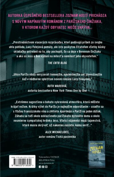 Po Zozname hosti znovu super kniha. Hlavna hrdinka je Jess, ktora usla pred problemami do Pariza a zavola bratovi Benovi ci u nho moze chvilu byvat. Jess pride do krasneho apartmanu ale Ben jednoducho zmizol… Znova su kapitoly pisane z pohladov viacerych postav-obyvalelov domu a my sa postupne dozvedame ich tajomstva a zaroven kto z nich je mozny vrah. Najprekvapujucejsi je koniec. Jednoznacne odporucam.