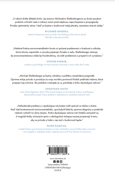 „Náboženské predstavy o apokalypse nás kedysi nútili správať sa dobre a slušne. Keď však kontaminovali environmentalistiku, spochybnili fakticky správne diagnózy a praktické riešenia vytlačili na okraj záujmu. Kniha Apokalypsa nehrozí núti čitateľa zamyslieť sa, či tragické titulky súčasných správ o ekologickom kolapse naozaj prispievajú k tomu, aby sa príroda a ľudia v nej mali v budúcnosti lepšie.“