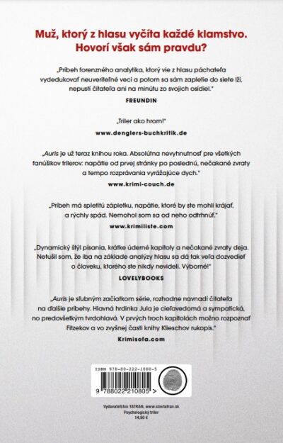 Auris (z latinského „ucho“) rozpráva o slávnom forenznom fonetikovi Mathiasovi Hegelovi, ktorý sa vďaka svojim schopnostiam pričinil o uväznenie mnohých zločincov. Na veľké prekvapenie kolegov sa Hegel dobrovoľne prizná k vražde a aj ho za ňu odsúdia. Zaujímavý námet knihy sa opiera o poznatky forenznej fonetiky. Ľudia s neobyčajne citlivým sluchom dokážu podľa zakašľania zistiť pohlavie, vek, pôvod, vzdelanie, dokonca aj veľkosť obuvi podozrivého. Zistiť sociálny a regionálny pôvod hovoriaceho je úplná samozrejmosť. Práca forenzného fonetika je dosť neobvyklá, s týmto vzrušujúcim povolaním sa v literatúre takmer nestretneme.