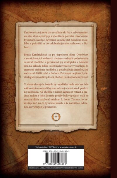 Bratia Kendrickovci sa po úspešnom filme Oratórium a neutíchajúcich ohlasoch divákov rozhodli podrobnejšie venovať modlitbe a preskúmať jej strategickú a biblickú silu. Na základe Biblie i osobných svedectiev vysvetľujú, čo znamená efektívna modlitba, a povzbudzujú čitateľov, aby nadviazali bližší vzťah s Bohom. Prinášajú zaujímavý plán strategickej modlitby, ktorá obohatí náš každodenný život.