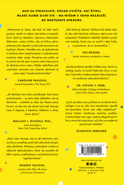 Ak dýchate, túto knihu potrebujete! Za jediný deň sa dvadsaťpäťtisíckrát nadýchneme a vydýchneme. No dýchame správne? Najnovšie štúdie ukazujú, že nie. Za tisíce rokov existencie ľudstvo prestalo správne dýchať, a to viedlo k vážnym následkom. Novinár James Nestor precestoval celý svet, aby zistil, ako sa stalo, že sme si osvojili zlé návyky pri dýchaní, a ako by sa to dalo napraviť. Nestor vyhľadal ľudí, ktorí objavili skryté umenie dýchacích praktík ako pránájáma, sudaršan, krijá a tumo a spojil poznatky starých majstrov s najnovšími vedeckými výskumami. Táto kniha približuje stratené umenie správneho dýchania. Sprostredkúva nám znalosti plaveckých trénerov aj indických mystikov a uznávaných ruských kardiológov, aby nám ukázal, akú dôležitú úlohu hrá dych v našom tele a akým spôsobom môžeme naše dýchanie zlepšiť.