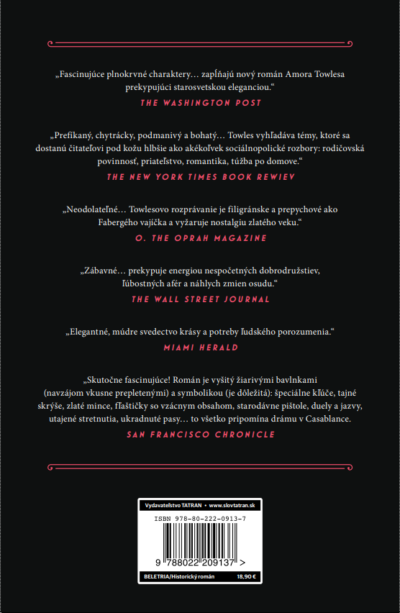 Grófove obmedzené priestory ho však zavedú do obrovského netušeného sveta emocionálnych objavov. Spriatelí sa s mnohými obyvateľmi hotela vrátane tvrdohlavej herečky, prešibaného straníckeho funkcionára, spoločenského Američana a náladového šéfkuchára. Keď mu však osud vloží do rúk život mladej dievčiny, musí použiť všetok dôvtip, aby jej zabezpečil budúcnosť, akú si zaslúži.