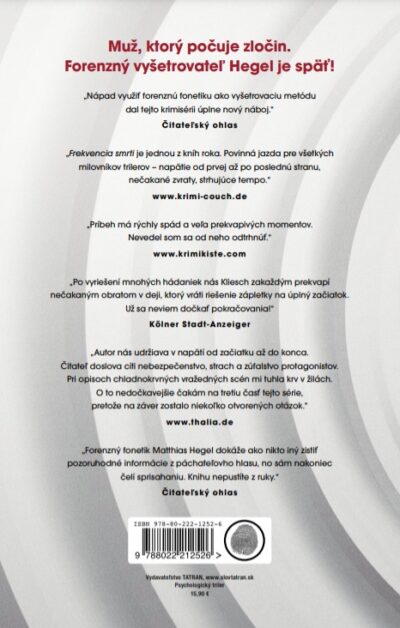 Dej pôsobí uletene a dosť absurdne, ideovo – proste klasický Fitzek. Čo ma sklamalo je, že sa forenznej fonetike venuje príbeh len v dvoch kapitolách – a to som očakávala že ťažiskom zápletky budú Hegelove schopnosti. Napriek tomu ma kniha bavila a záver knihy ma navnadil na ďalšie pokračovanie.