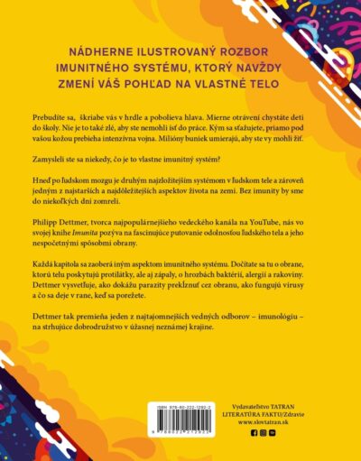 Jedinečne ilustrovaný náhľad do sveta imunitného systému. Autor, populárny tvorca edukatívnych videí, využíva svoj overený rozprávačský štýl a čitateľom ponúka dobrodružný výlet krajinou ľudského tela a jeho obranyschopnosťou. Každá kapitola osvetlí iný aspekt imunológie vrátane obranných mechanizmov, akými sú protilátky a zápaly, ale aj hrozieb, ktoré pre nás predstavujú baktérie, alergény či rakovinotvorné bunky. Autor odhaľuje, ako sa parazity prepašujú do tela, ako fungujú vírusy a čo sa deje v rane, keď sa porežeme. Imunita je dôležitá, zábavná a hodnotná kniha, ktorá si nájde miesto v každej rodinnej knižnici.