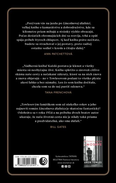 Lincolnovu diaľnicu odporúčam milovníkom historickej fikcie a pomalšieho, nelineárneho deja zameraného skôr na charaktery postáv. Amor ma trafil šípom priamo do môjho čitateľského srdca a ja sa už teraz teším, ako si prečítam aj jeho Džentlmena z Moskvy.