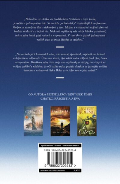 Wm. Paul Young vo svojich celosvetových bestselleroch Chatrč, Rázcestia a Eva vykreslil trojjediného Boha prekvapivým a poučným spôsobom, ktorý možno naštrbí naše hlboko zakorenené predstavy o ňom, ale je vždy zameraný na večnú podstatu Božej lásky, ktorá objíma všetko a každého.