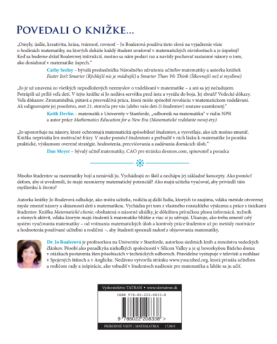 Autorka knižky Jo Boalerová odhaľuje, ako môžu učitelia, rodičia aj ďalší ľudia, ktorých to zaujíma, vďaka metóde otvorenej mysle zmeniť názory a skúsenosti detí s matematikou. Vychádza pri tom z vlastného rozsiahleho výskumu a práce s tisíckami študentov. Knižka Matematické cítenie, obohatená o názorné ukážky, je dôležitou príručkou plnou informácií, techník a rôznych aktivít, vďaka ktorým majú študenti k matematike bližšie a viac si ju užívajú. Ukazuje, ako treba zmeniť celý systém vyučovania matematiky – od vnímania matematických úloh a kontroly práce študentov až po metódy motivácie a hodnotenia používané učiteľmi a rodičmi, aby študenti spoznali radosť z objavovania matematiky.