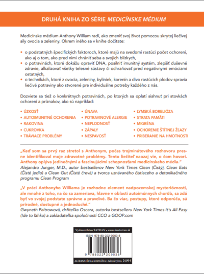 Medicínske médium ANTHONY WILLIAM pomohol desaťtisícom ľudí dostať sa zo zdravotných problémov, ktoré im lekári nesprávne diagnostikovali, nevhodne liečili alebo ich vyliečiť vôbec nevedeli. Darí sa mu to vďaka božskému hlasu, ktorý mu doslova šepká do ucha a prezrádza korene ľudských trápení či chorôb, ako aj prostriedky na ich liečbu. Vo svojej prvej knihe, v bestselleri New York Times Medicínske médium, Anthony prezradil, ako zostaviť špecifické liečebné plány na desiatky chorôb, pri ktorých výživa zohráva hlavnú úlohu.