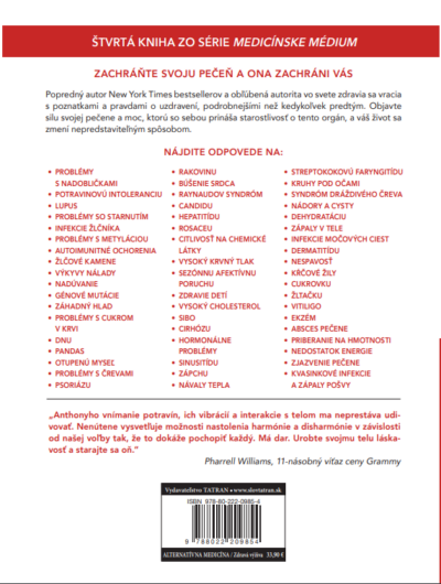 Kniha Medicínske médium: Záchrana pečene ponúka odpovede, ktoré ste mali poznať už veľmi dávno. Medicínske médium Anthony William s typickým zanietením prináša jedinečný pohľad na doposiaľ neobjavené funkcie tohto životodarného orgánu, vysvetľuje, čo sa skrýva za desiatkami zdravotných problémov, ktoré nám strpčujú život, a ponúka detailný návod, ako máme postupovať, aby sme ho prežili čo najlepšie. Sami zistíte, čo so sebou prináša takáto záchrana pečene – budete rozvážnejší, pokojnejší, šťastnejší a schopnejší prispôsobiť sa dnešnej hektickej dobe. Dozviete sa, ako zlepšiť spánok, nastoliť rovnováhu cukru v krvi, znížiť krvný tlak, schudnúť či vyzerať a cítiť sa mladšie. Zdravá pečeň vás zbaví stresu, bude to váš spojenec v boji.