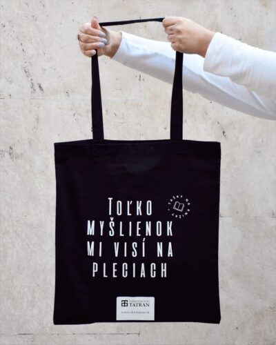 8.90 €Kvalitná ekologická bavlnená taška v čiernej farbe s nápisom TOĽKO MYŠLIENOK MI VISÍ NA PLECIACH poteší nielen milovníkov Sartra či Nietzscheho, ale všetkých knihomoľov, ktorí si nemajú v čom odniesť…
