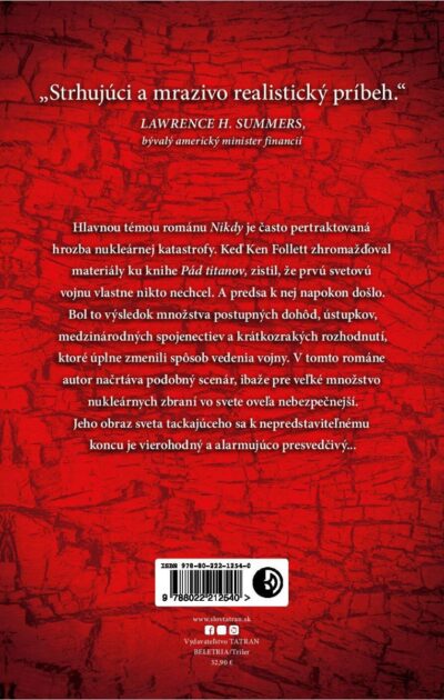 Aj keď nejde o top Folletovku, stále ma autor prekvapuje dôležitosťou tém. Hrozba jadrovej vojny bola na svete počas 60. a 70. rokov. No čo ak by sa vyskytla v dobe internetu, satelitov, drešných lídrov a rozdelenej spoločnosti? Nikdy je napínavý, poučný a svižný príbeh. Strany sa len tak obracajú samé. Nečakaný koniec ma presvedčil v tom, že autor dokáže aj v súčasnej téme zabodovať. Odporúčam.