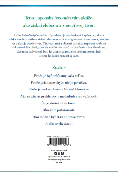 Veľmi nešťastný mladý muž sa stretne s filozofom, ktorý mu vysvetlí, že každý je strojcom vlastného života. Filozof považuje za hlavný predpoklad šťastného života aj osobnú angažovanosť mladíka: mal by sa vymaniť spod vplyvu minulých skúseností, pochybností a očakávaní, ktorými ho zaťažujú iní. Základ dojímavého dialógu tvoria poznatky Alfreda Adlera, veľkého priekopníka individuálnej psychológie. Vnútorne sa oslobodíme, ak budeme ignorovať obmedzenia, ktorými nás brzdia naši blížni aj my sami. Japonský bestseller Odvaha byť neobľúbený je prístupný, hlboký a mimoriadne múdry sprievodca životom. Prečítali si ho milióny ľudí, ktorí ťažili z jeho múdrosti.