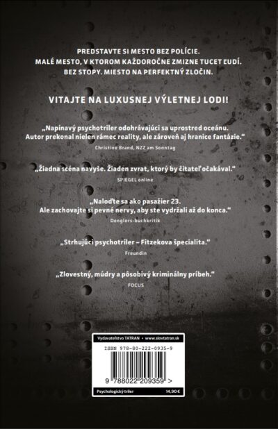 Náhle objavenie zmiznutého dievčatka, opakovaná dráma samovraždy na výletnej lodi, objasnenie smrti Martinovej ženy a syna… Fitzek je známy ako kráľ psychothrillerov – vo svojich knihách rád využíva rôzne ochorenia a psychické problémy. Aj keď tvrdí, že Pasažier 23 je román, myslím, že paranoidné stavy a obviňovanie každej postavy Vás neminie ani v tejto časti. Samozrejme si popritom budete opakovať, že nikdy nepôjdete na výletnú loď.