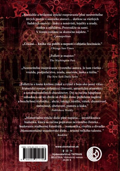 Piliere Zeme sú za posledné desaťročia najčítanejšou historickou knihou na všetkých kontinentoch. Čitateľa strhne nielen autorov obdiv k staviteľom gotických katedrál, ale aj detailný opis anglického stredoveku v celej jeho brutalite a pretvárke. Krásu však nájdeme v charakteroch jedincov, ktorí po sebe zanechali nehynúce skvosty týčiace sa k nebu, aby vzdali hold Pánovi. Po nečakanom úspechu Pilierov Zeme sa Ken Follett plne zameral na historický román. Jeho ďalšie diela Na veky vekov, Ohnivý stĺp a najnovšie Večer a ráno sú len ďalšími vavrínovými vencami v jeho zbierke, akoby mu bol historický román súdený. Zrada a nenávisť hnané chamtivosťou nachádzali v neistých časoch stredoveku veľmi živnú pôdu a pre zručného spisovateľa predstavujú skvelý námet. Úspech Pilierov Zeme spočíva v živom obraze doby, v ktorej sa náhle ocitneme. V dvanástom storočí zúril v Anglicku neľútostný boj o následníctvo, šľachta a cirkev sa dostali do konfliktu so súperiacimi stranami a ľud bol len rukojemníkom znepriatelených rodov. Napriek impozantnému rozsahu diela sa čitateľ ani na okamih nenudí a napätie ruka v ruke so zvedavosťou nepoľavuje. Zvraty v osudoch jednotlivých postáv dojímajú dušu, ale nositeľkou deja je Follettova bytostná vášeň, anglická gotická katedrála.