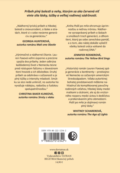 Annelisin manžel dostane ponuku odísť s rodinou do Ameriky, ale starí rodičia musia zostať v nepriateľskej krajine. Annelisina vnučka Claire po mnohých rokoch za veľkou mlákou náhodou naďabí na prababičkine listy z Nemecka a pochopí, aké obete musela priniesť jej rodina. Tento jedinečný román je nabitý emocionálnym bohatstvom, ktoré autorka čerpá z rodinnej korešpondencie. Príbeh hneď na začiatku vtiahne čitateľa do deja a doslova hypnotizujúca téma v ňom vyvolá množstvo emócií.