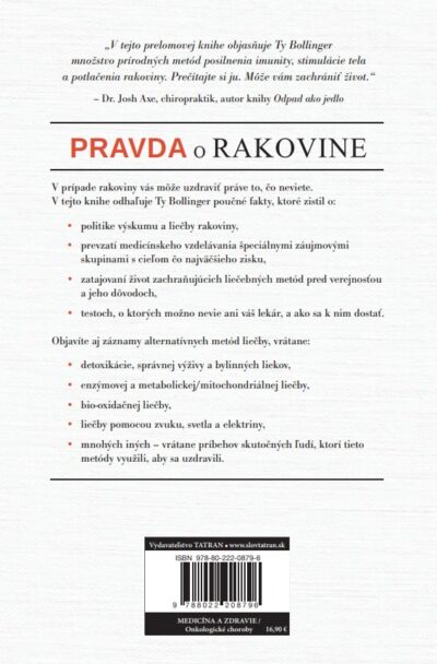 Ty vysvetľuje, že existuje mnoho spôsobov, ako liečiť rakovinu a predchádzať jej. Tie vysoko prevyšujú chemoterapiu, ožarovanie a operácie, ibaže o nich nevieme. Pravda o rakovine sa ponára do histórie medicíny – až do čias Hippokratovho kréda „neubližovať“ – a prináša prenikavý pohľad na účinnosť množstva nekonvenčných liečebných metód rakoviny, ktoré pomáhajú pacientom po celom svete. Dočítate sa o rakovinovej politike, o faktoch a mýtoch, o jej príčinách (rodinná anamnéza je len jednou časťou skladačky) a širokej škále dostupných nástrojov na diagnostiku a liečbu tejto choroby.