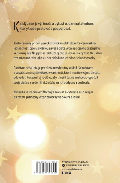 Táto malá knižočka je plná múdrosti. Je rozdelená na dve časti. Prvá obsahuje krátky príbeh na spoločné čítanie rodiča a dieťaťa. Mama sa v ňom rozpráva s dcérou o tom, v čom sú jej silné stránky, jej výnimočnosť, a ako nestratiť s vekom tvorivosť a kreativitu. Slovami dcéry: to je taká zlatá knižka! Veru. Príbeh je plný lásky, snahy porozumieť a povzbudiť.
