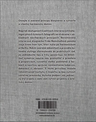 Renomovaná interiérová dizajnérka Frida Ramstedtová ponúka svoje know-how tým, ktorí túžia po harmonickom príbytku. Rokmi overené zákonitosti a pravidlá bytového stylingu sformulovala do praktických rád. Jej jednoduché tipy a triky upozorňujú na dôležitosť symetrie, naučia nás premýšľať o priestore a proporciách, vysvetlia všetko podstatné o farbách a navrhnú správne rozmiestnenie kobercov, dekorácií či obrazov.