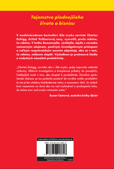 Charles Duhigg, rovnako ako v Sile zvyku, spája najnovšie vedecké výskumy, hĺbkovú investigatívu a komplexné príbehy do jasnejších, ľudskejších úvah o tom, ako dospieť k produktivite. Závažnú spoločenskú diskusiu sa mu podarilo postaviť do nového svetla: produktivita nie je len otázkou každodennej rutiny a zoznamov úloh. Je výsledkom nazerania na život ako na rad rozhodnutí a pochopenia toho, že máme moc nad svojím vnímaním sveta.
