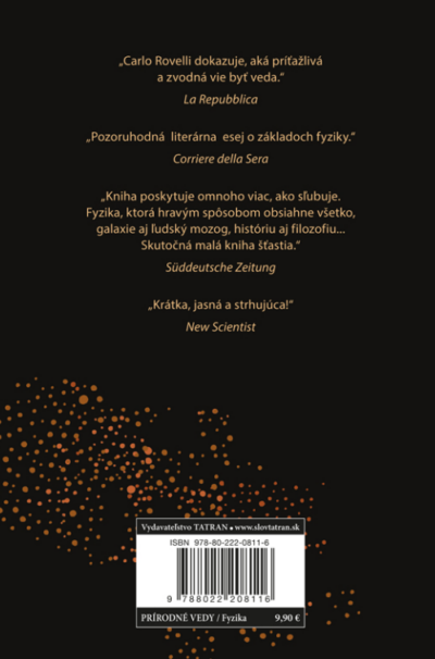 Krátka, jasná a strhujúca. Skutočná malá kniha šťastia, ktorá hravým spôsobom obsiahne život – hovorí o vesmíre, galaxiách, ale aj o ľudskom mozgu, začrie do histórie a filozofie, ale neobíde ani teóriu relativity či kvantovú mechaniku. Carlo Rovelli vo svojej knihe dokazuje, aká príťažlivá a zvodná vie byť veda a robí to formou pozoruhodnej literárnej eseje.