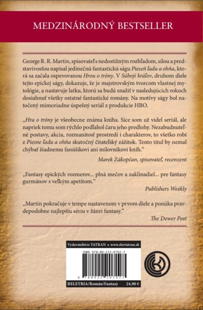 V Súboji kráľov, druhom diele tejto epickej ságy, dokazuje, že je majstrovským tvorcom vlastnej mytológie, a nastavuje latku, ktorú sa budú snažiť v nasledujúcich rokoch dosiahnuť všetky ostatné fantastické romány.Na motívy ságy bol natočený́ mimoriadne úspešný seriál z produkcie HBO.