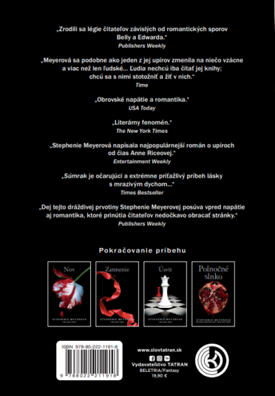 Nezvyčajný ľúbostný príbeh gymnazistky a upíra sa stal literárnym fenoménom a romantickým zážitkom pre celú jednu generáciu. Stephenie Meyerová sa po vydaní Twilight ságy stala hviezdnou spisovateľkou tínedžerov na všetkých kontinentoch, ale so záujmom si ju prečítali aj skôr narodení. Na svete sa predalo cez 160 miliónov výtlačkov kníh Stephenie Meyerovej a mnohí ich už teraz označujú za modernú klasiku.