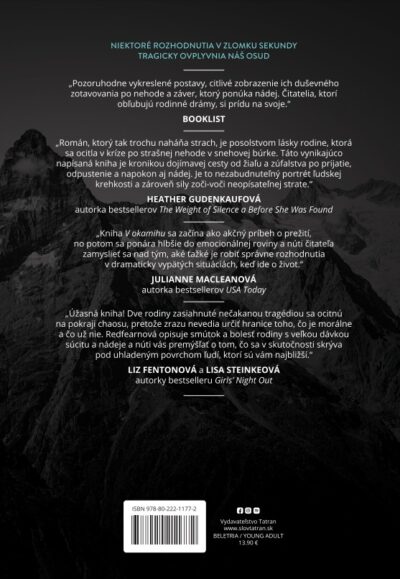 Suzanne Redfearnová si zvolila nezvyčajný spôsob rozprávania – a trafila do čierneho. Šestnásťročná Finn Millerová rozpráva príbeh do najmenších detailov, ako to zvyknú len tínedžeri. Ale Finn už nie je medzi živými. Finn sa s rodinou a najlepšími priateľmi vyberú na chatu. Radostné dobrodružstvo v snehovej metelici sa skončí tragédiou – ľahkomyseľní odvážlivci sa zrútia z útesu. Neľútostný boj o záchranu vtiahne čitateľa do víru emócií zavalených snehovou perinou. Ide o život a odrazu spoznávame nepeknú pravdu o ľudskej povahe. V okamihu je silný a dojímavý príbeh. Upozorňuje nás, že istoty nejestvujú a je potrebné neustále spochybňovať všetko, čo si myslíme o sebe a o ľuďoch, ktorým bezhranične dôverujeme.