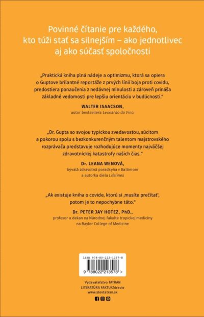 Gupta zdôrazňuje nevyhnutnosť vyhľadávať presné informácie z overených zdrojov, vzájomne spolupracovať a nie bojovať proti sebe a škriepiť sa. Poskytuje unikátny pohľad do sveta verejného zdravia, delí sa s nami o dojímavé príbehy jednotlivcov a odpovedá na množstvo otázok. Nevyhýba sa ani toľko medializovanej a spochybňovanej téme vakcín, vysvetľuje, prečo ich vyvinuli tak rýchlo a na akej báze fungujú; vysvetľuje tiež, ako je možné, že vírus COVID-19 si vyberá predovšetkým chorých, obéznych a oslabených, prečo niekto neochorie či má bezpríznakový priebeh. Naráža aj na problematiku vedľajšieho efektu pandémie – odhalenie dlhodobých sociálnych problémov a našu doteraz skrytú schopnosť konečne ich riešiť. Pandémia totiž napriek všetkému zlému a tragickému odhalila i ľudskosť v nás. Autor zdôrazňuje, aby sme nemysleli len na seba, ale aj na ostatných, a ponúka praktické tipy, vďaka ktorým sa ľahšie zmierime s novým „normálom“, vyrovnáme so stratami a začneme opäť napredovať.