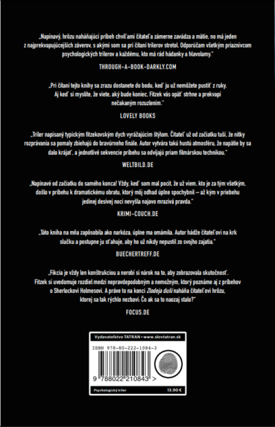 Milujem knihy od Fitzeka, mám doma takmer všetky (kolekcia Auris je na ceste:)), ale v prípade tejto som sa bála, akože naozaj naozaj bála. Neviem či to bolo spôsobené tým, že to bola v poradí 4 kniha za 2 týždne čo som čítala od neho, alebo či celé to prostredie na mňa vplývalo, ale nemohla som knihu odložiť aj keď som mala zimomriavky. Túto knihu, ako aj všetky od tohto autora, odporúčam 🙂