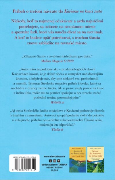 Od Streleckého mám prečítanú celú sériu kníh o kaviarni na konci sveta. Je jednoducho napísaná, rýchlo sa číta, je podnetná, nečakajte ťažkú terminológiu, taká motivačná oddychovka s posolstvom užívať si život.